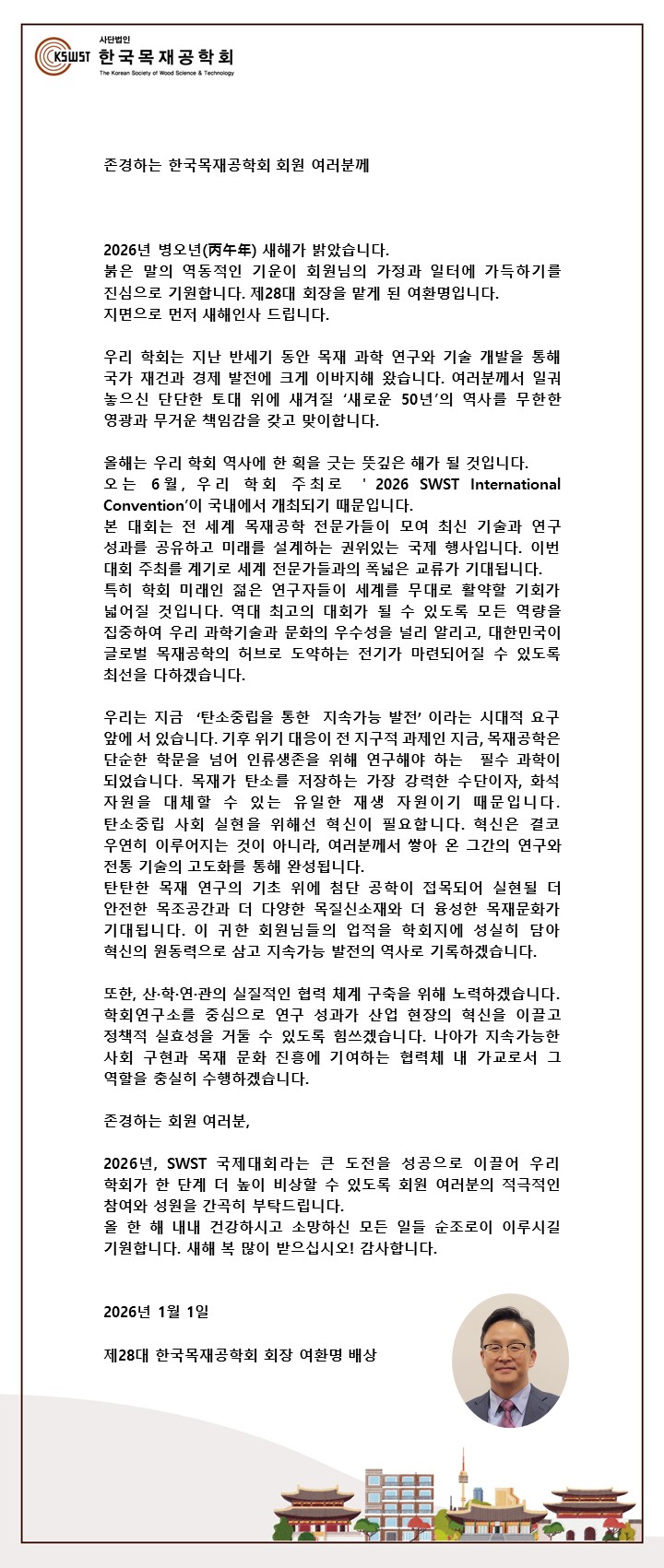 한국목재공학회 주최로 2026 SWST International Convention이 6월에 개최되며, 이 대회 홈페이지가 1월 중 곧 개설됩니다.