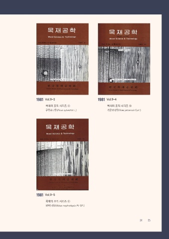 1981 Vol.9-3 1981 Vol.9-4 목재의 조직 시리즈 ⑨ 목재의 조직 시리즈 ⑩ 구주소나무(Pinus sylvestris L.) 가문비나무(Picea jezoensis Carr.) 1981 Vol.9-5 목재의 조직 시리즈 ⑪ 분비나무(Abies nephrolepis Fir SP.) 34 한국목재공학회 50년사 2장 사진으로 본 학회 역사 | 학회지 표지 변천사 34 35 35